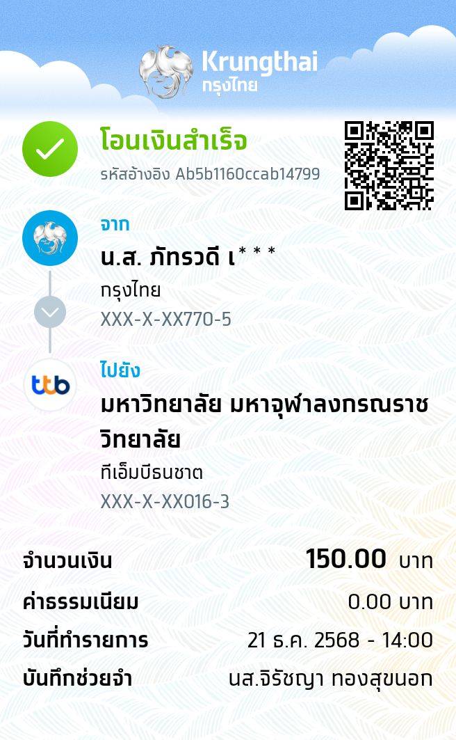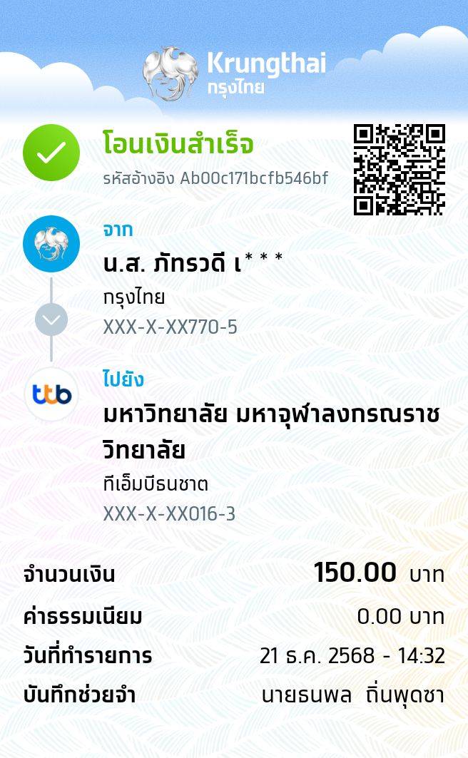 | 211 | จิรัชญา ทองสุขนอก | 150 | 21/12/2568 | 14.01 | ดูภาพ | |