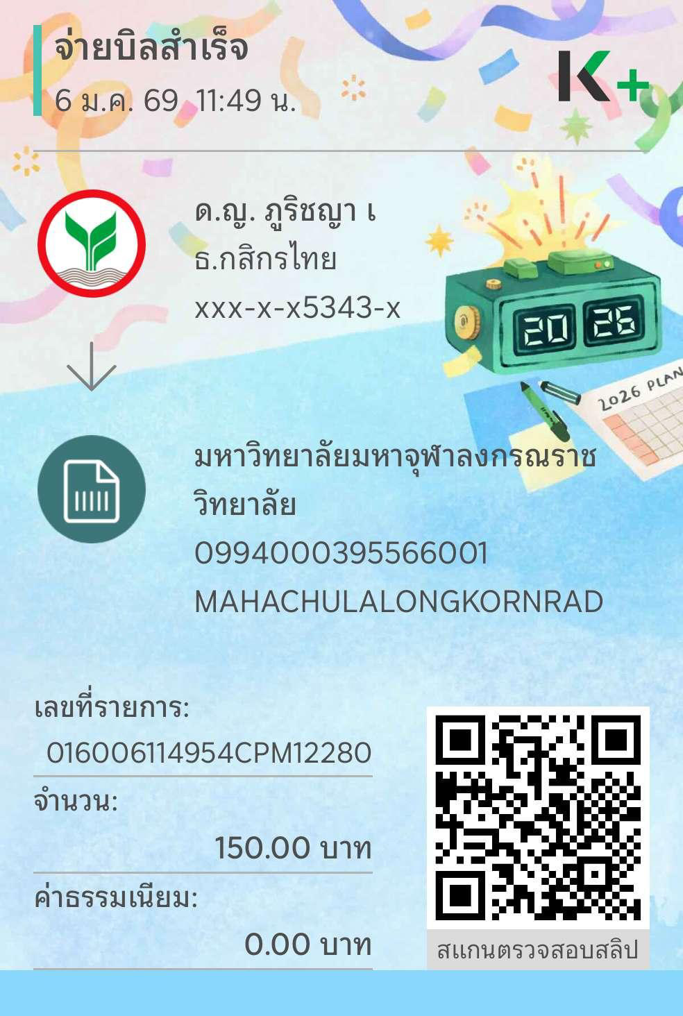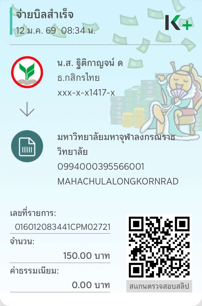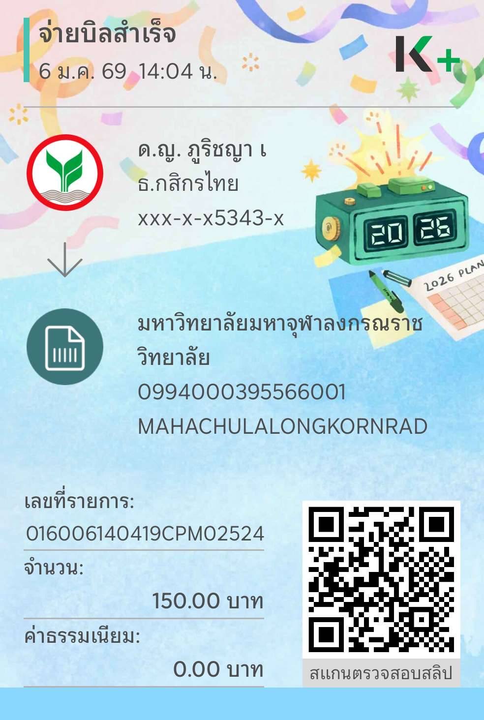 | 219 | ภัทริกา จระคร | 150 | 07/01/2569 | 10.50 | ดูภาพ | |