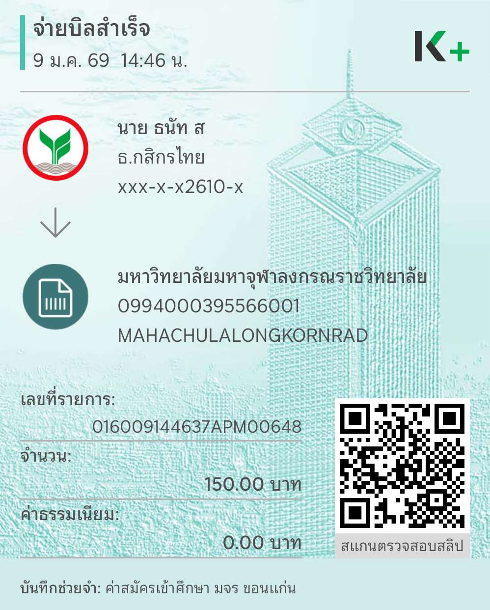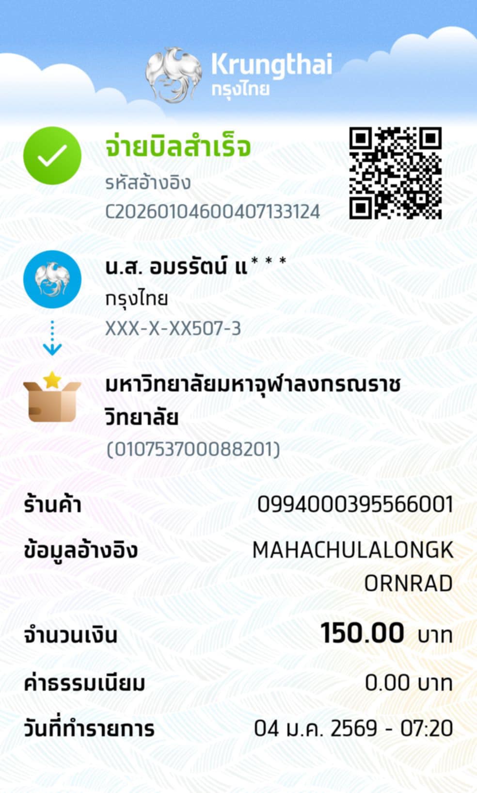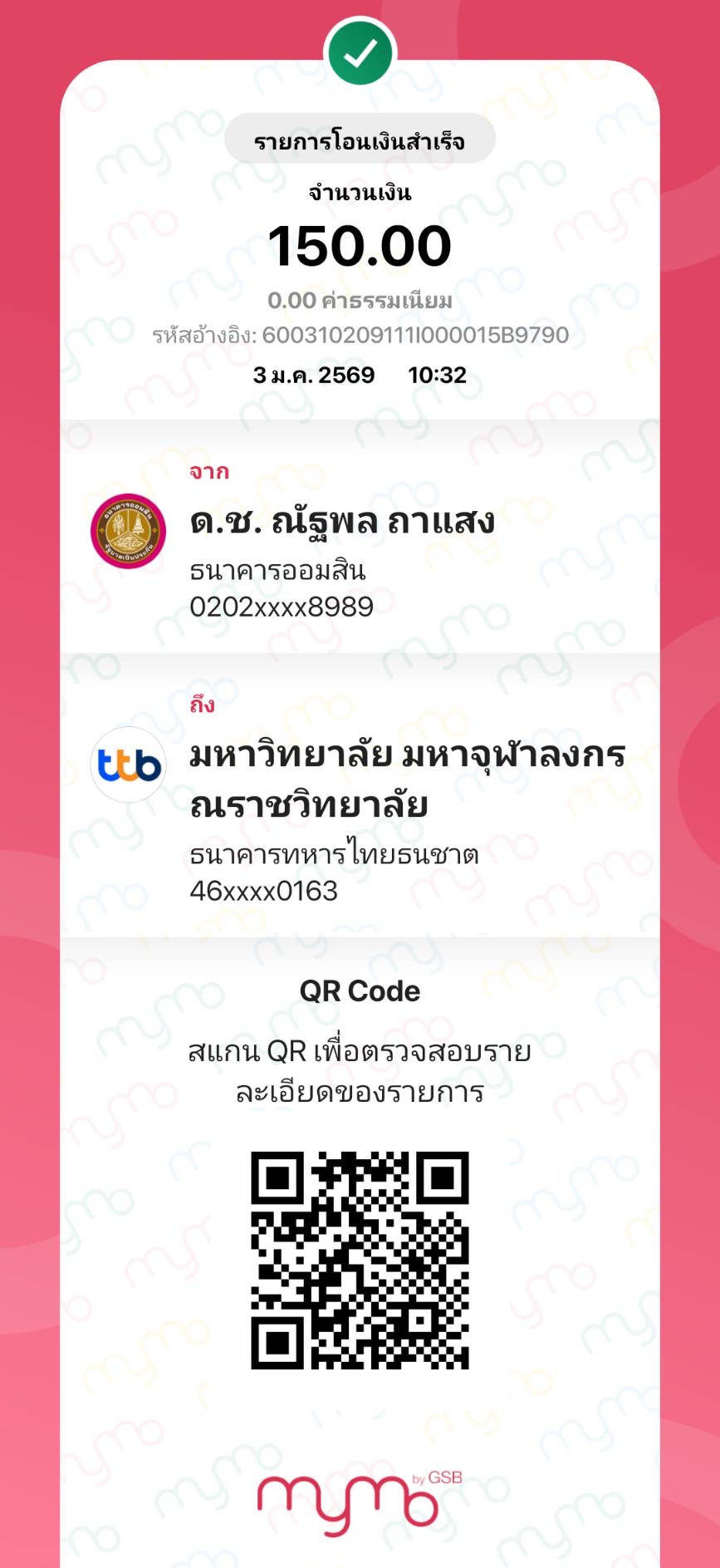 | 219 | ภัทริกา จระคร | 150 | 07/01/2569 | 10.50 | ดูภาพ | |