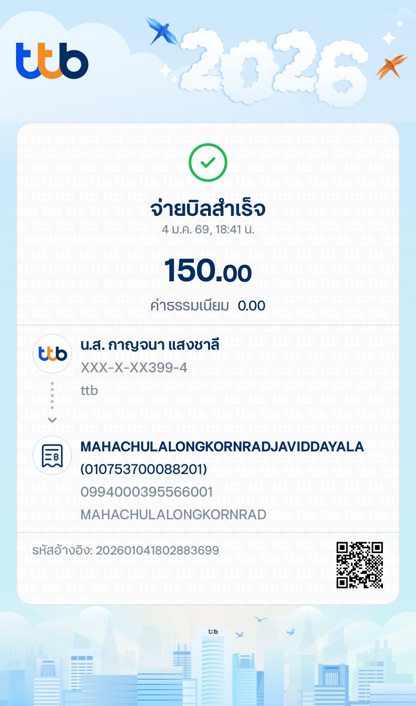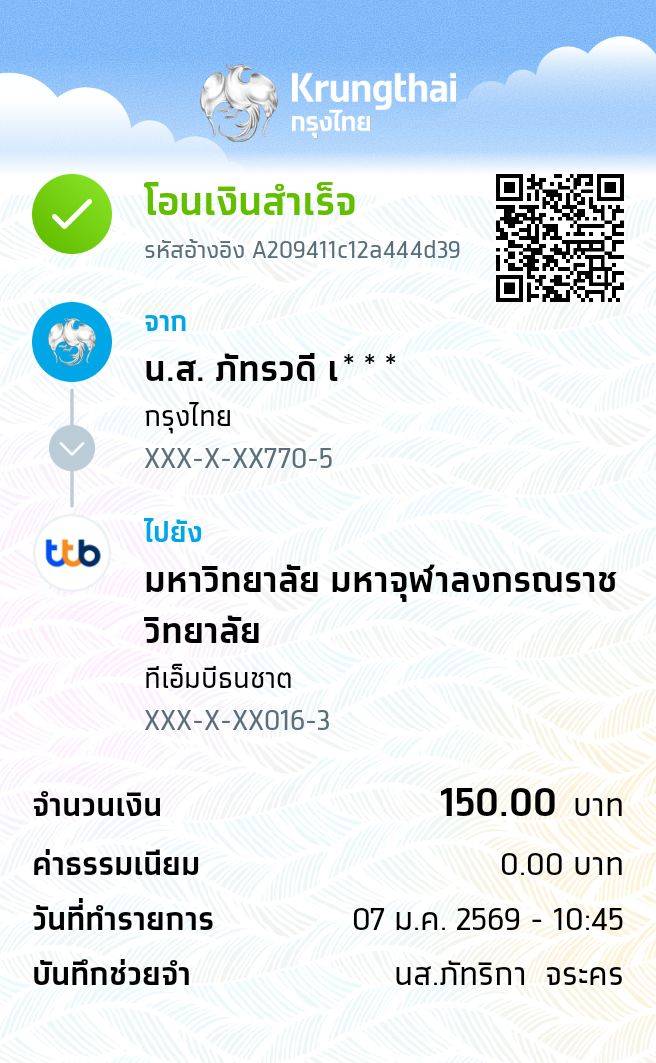 | ลำดับที่ | ชื่อ - ฉายา/นามสกุล | สาขาวิชา | จำนวน (บาท) | โอนชำระวันที่ | เวลา | สำเนาสลิปการโอน |