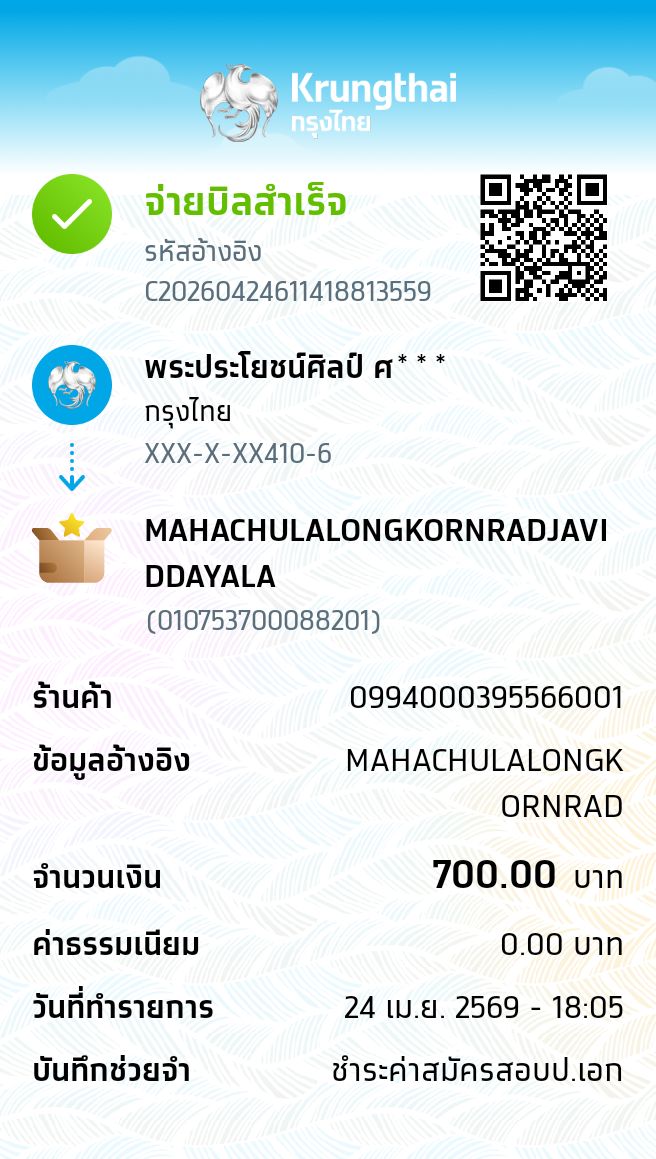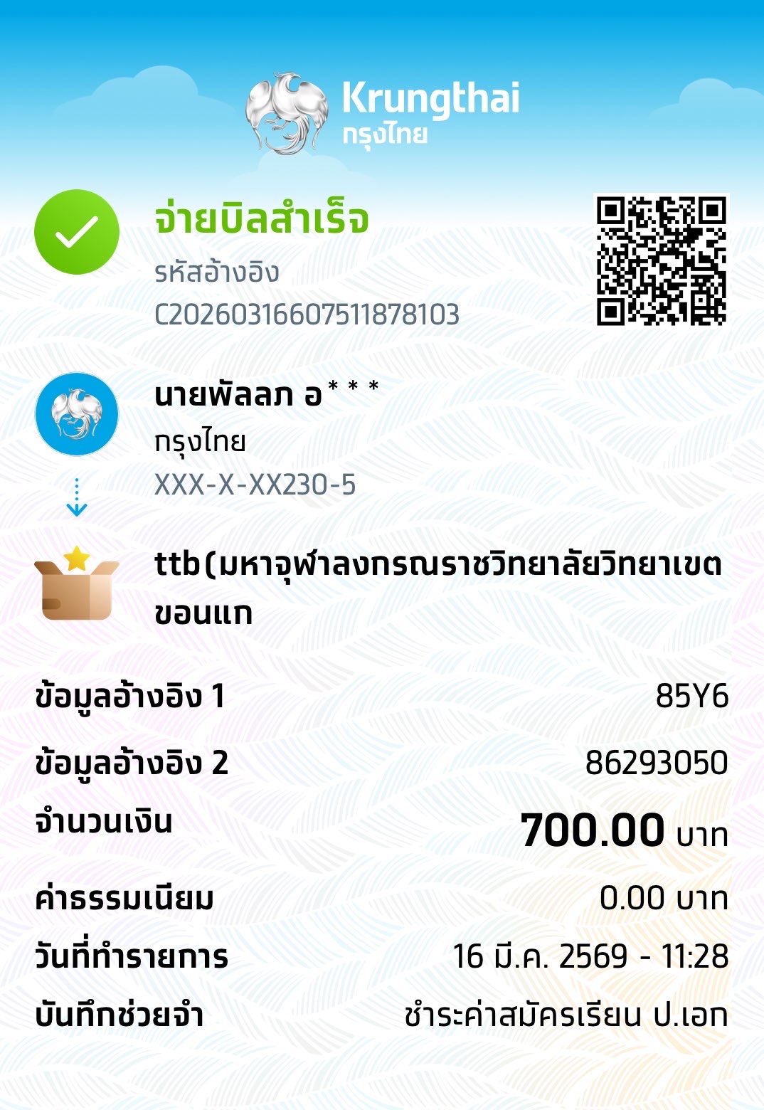 | 256 | นายวัชระ ขันสังข์ | พระพุทธศาสนา (ป.โท ภาคปกติ) | 700 | 10/03/2569 | 20.34 | ดูภาพ |