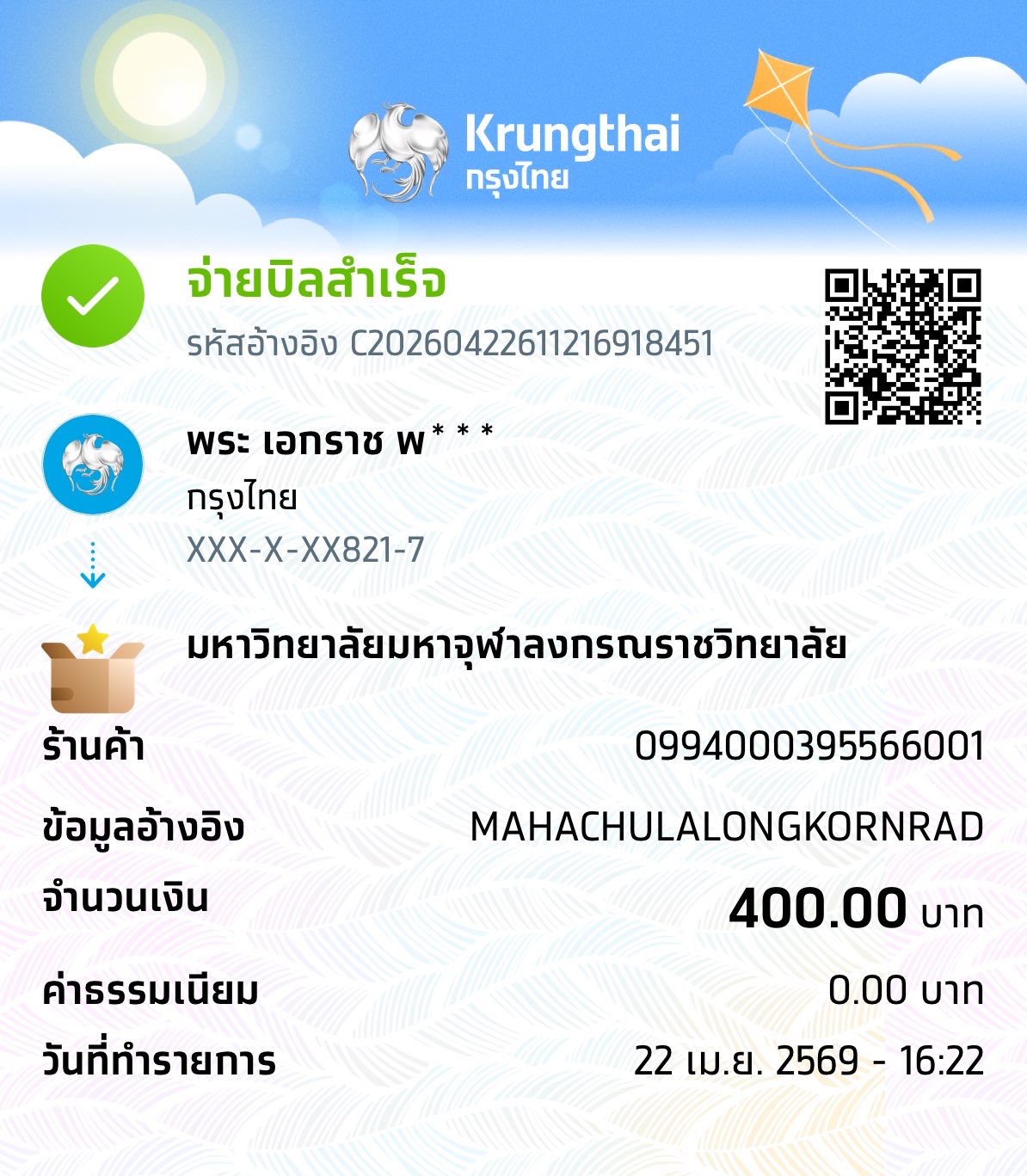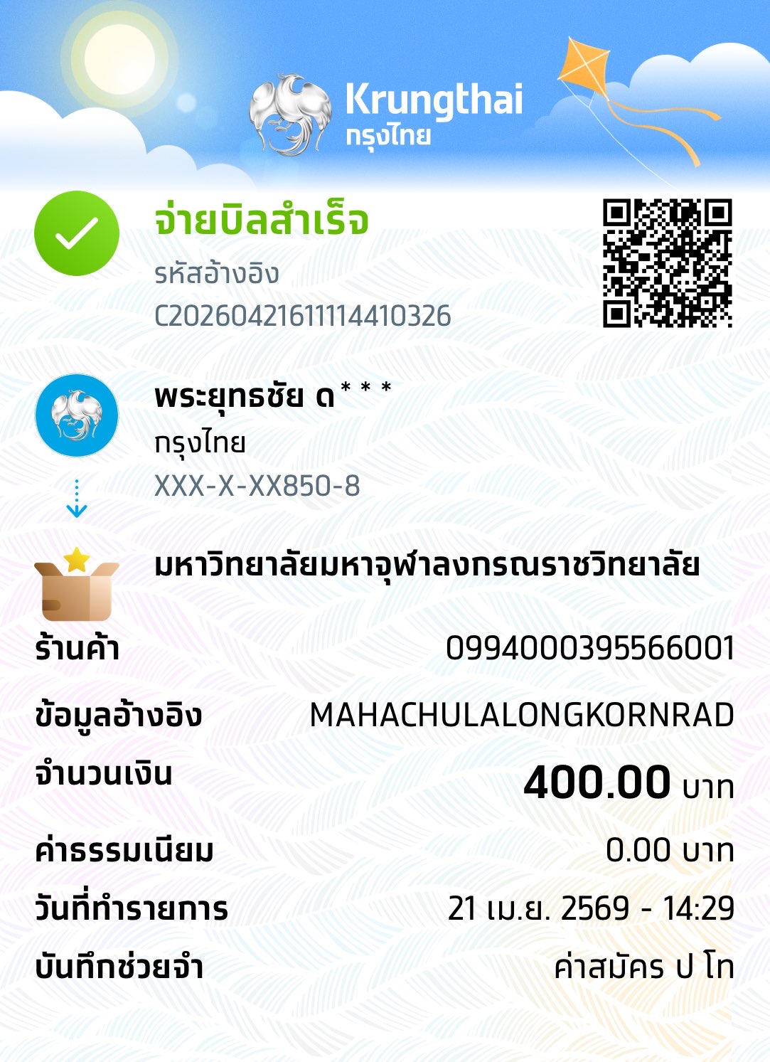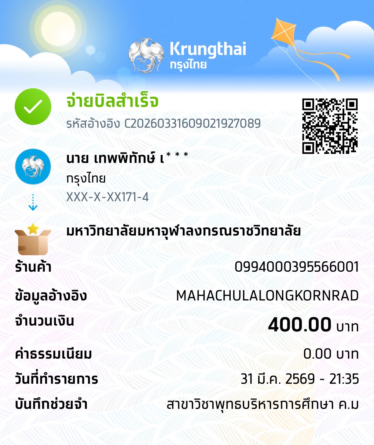 | 273 | นายชานนท์ ชนะชัย | พระพุทธศาสนา (ป.โท ภาคปกติ) | 400 | 29/03/2569 | 22.13 น. | ดูภาพ |