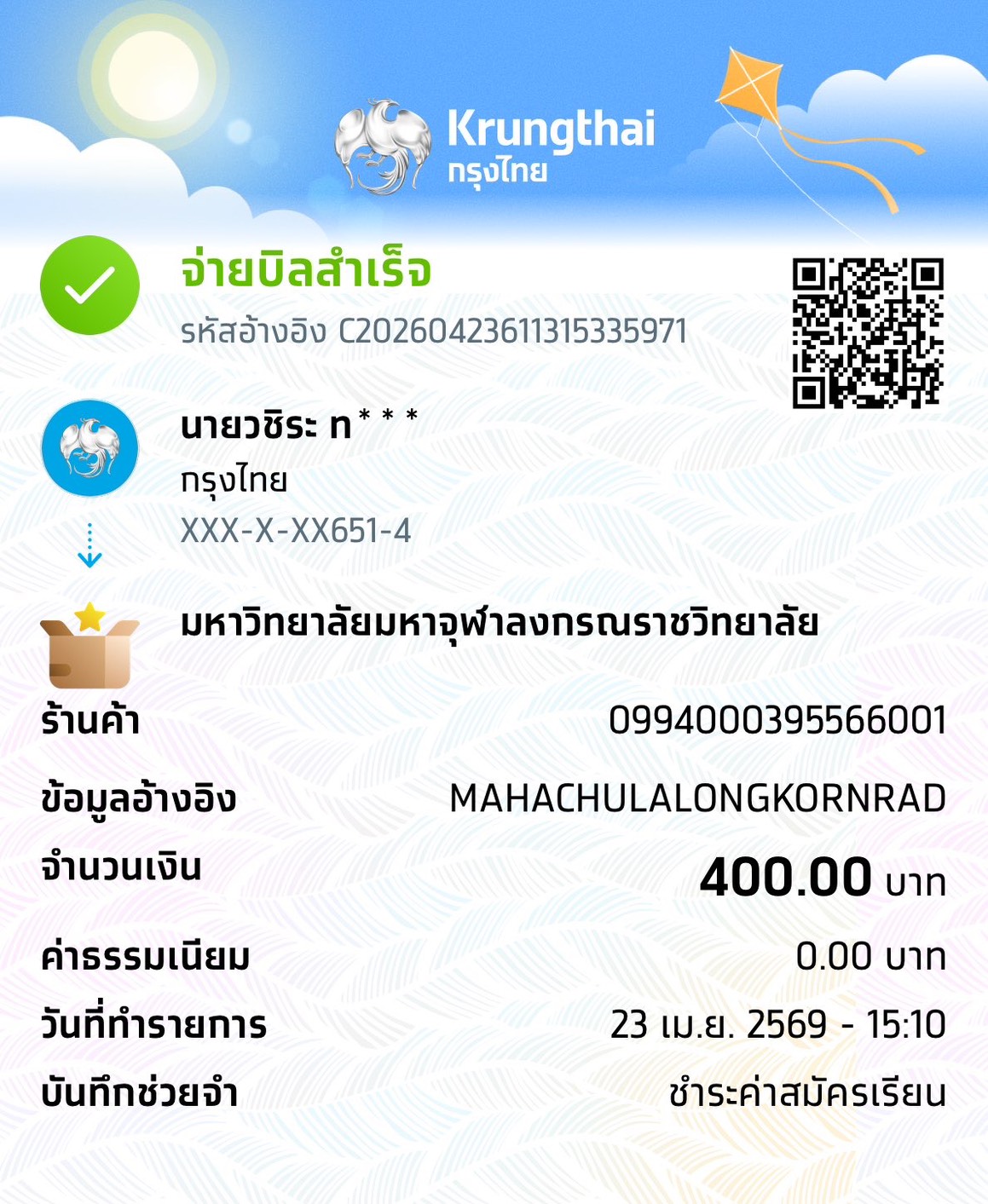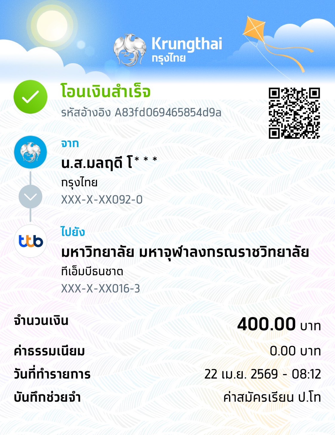 | 26 | จิรภิญญา ชัยสาสตร์ | 400 | 31/01/2567 | 14.47 น. | ดูภาพ | |