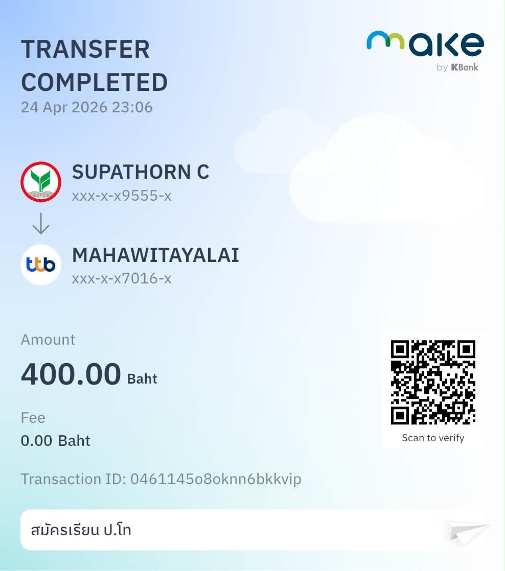 | 2 | นายณษกฤษ คาดีวี | 400 | 31/10/2566 | 16.38 | ดูภาพ | |
