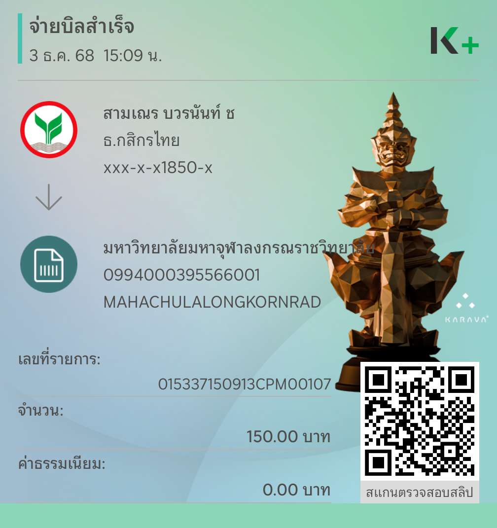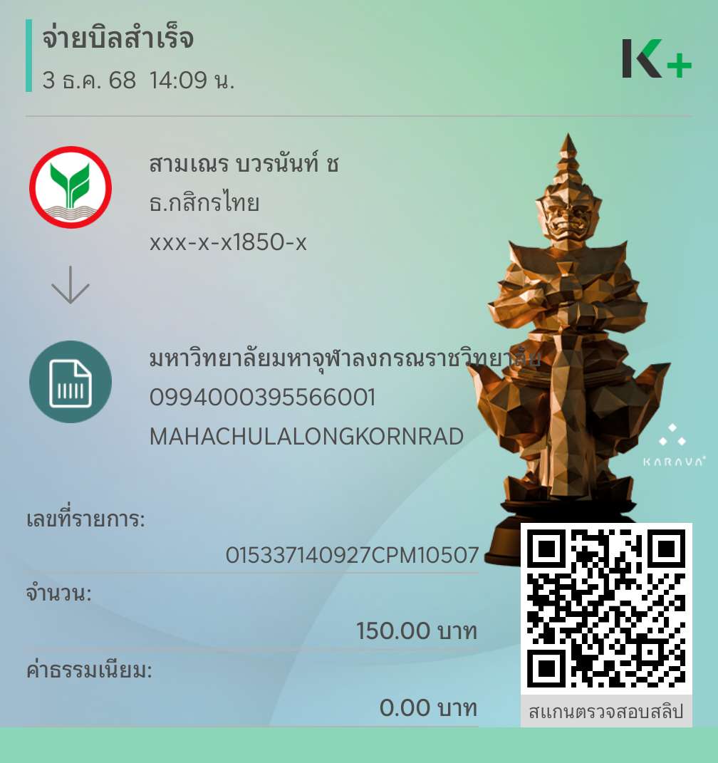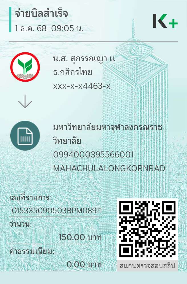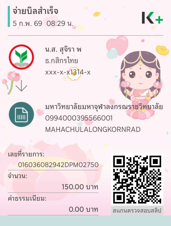 | ลำดับที่ | ชื่อ - ฉายา/นามสกุล | สาขาวิชา | โครงการ | จำนวน (บาท) | โอนชำระวันที่ : เวลา | สำเนาสลิปการโอน |
