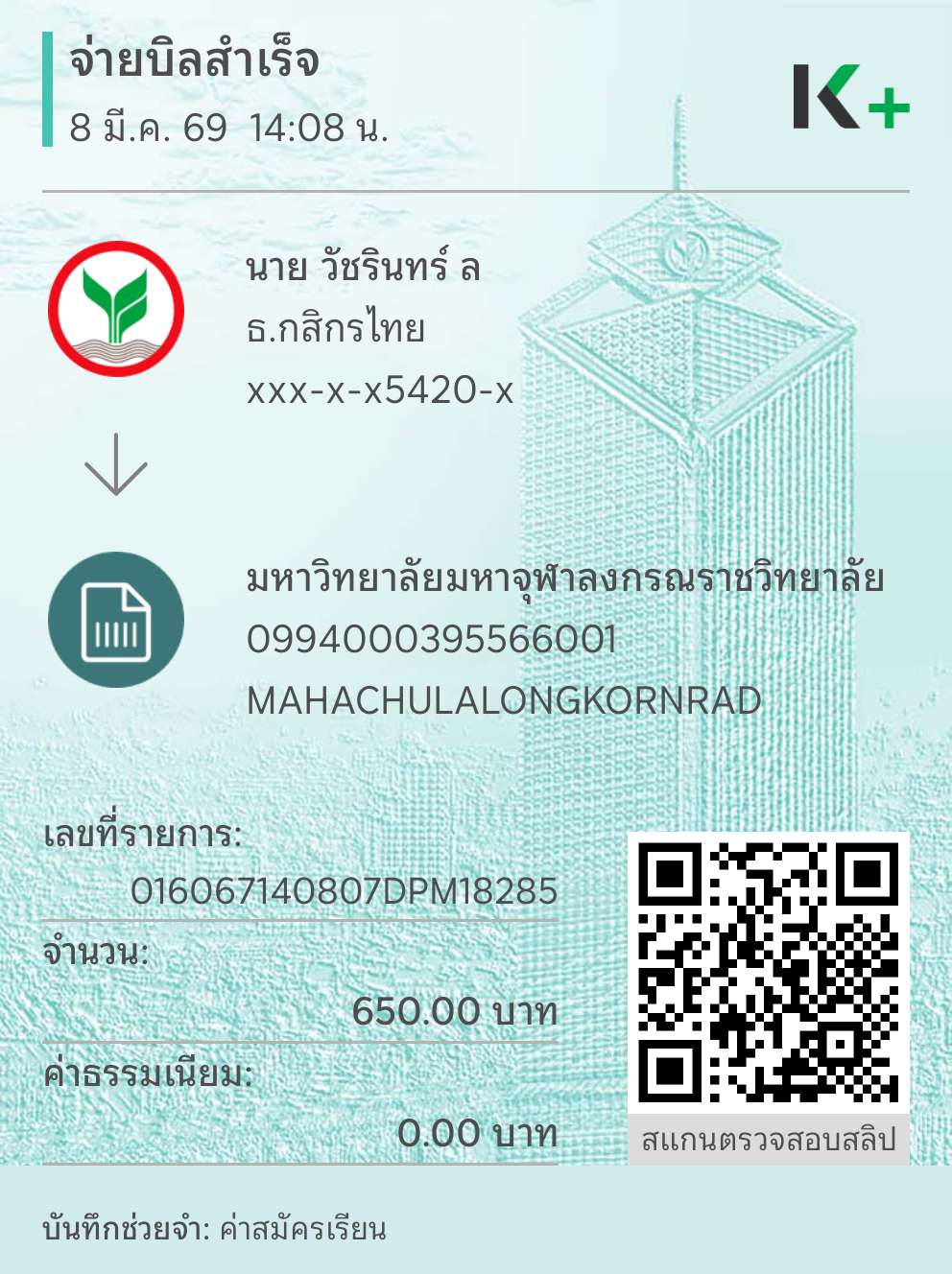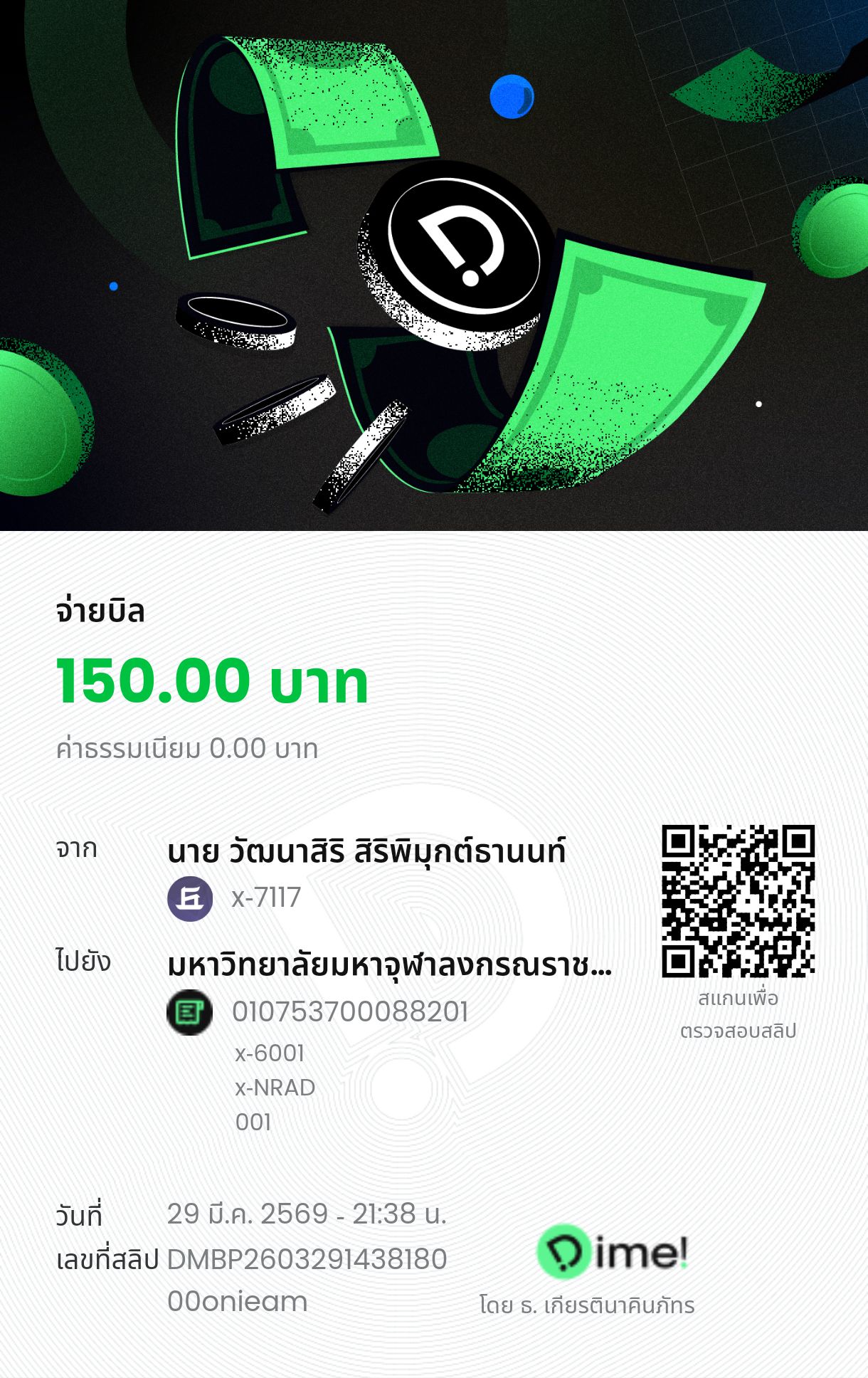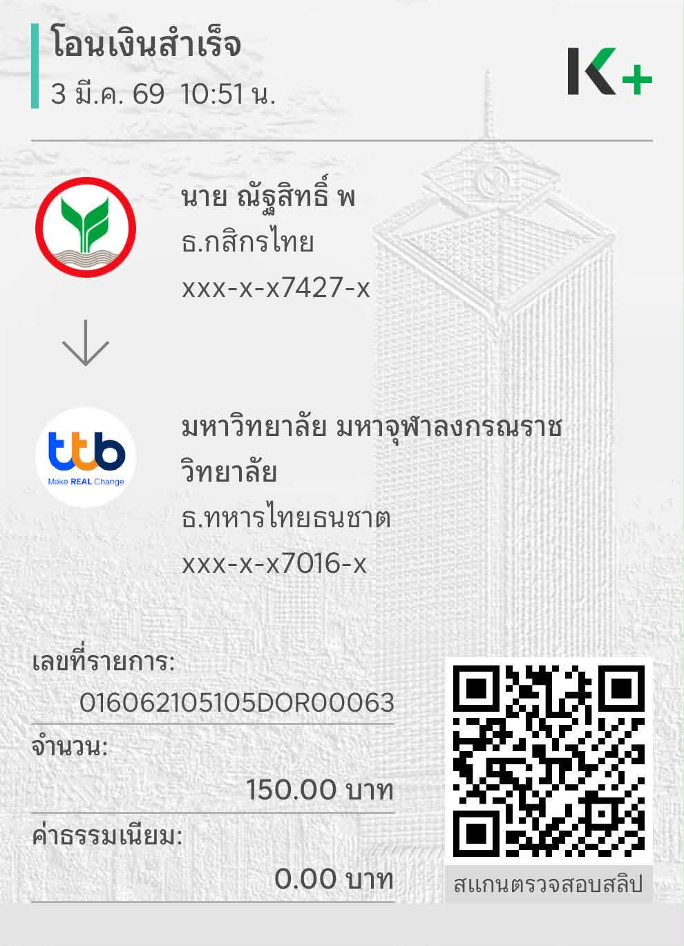 | ลำดับที่ | ชื่อ - ฉายา/นามสกุล | สาขาวิชา | โครงการ | จำนวน (บาท) | โอนชำระวันที่ : เวลา | สำเนาสลิปการโอน |