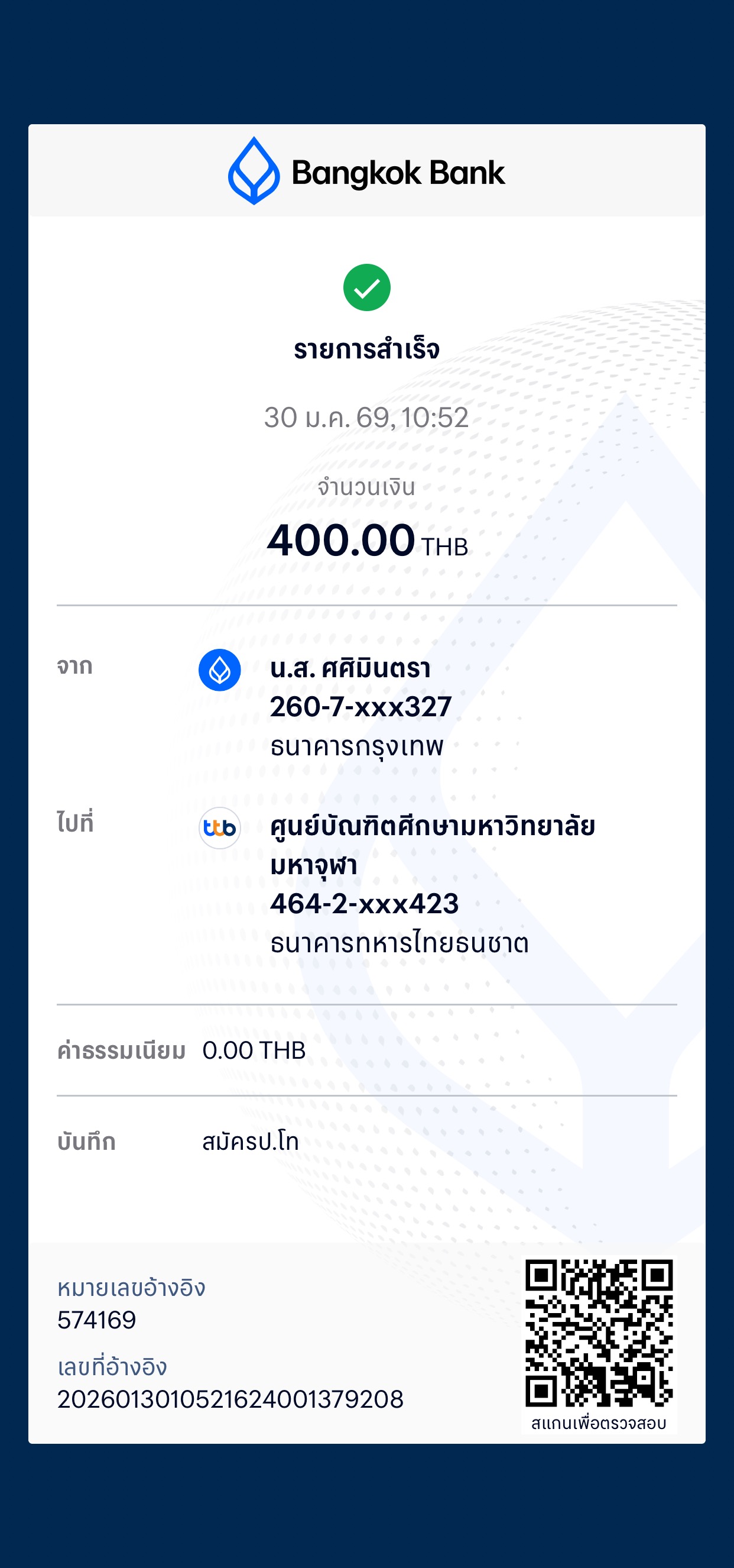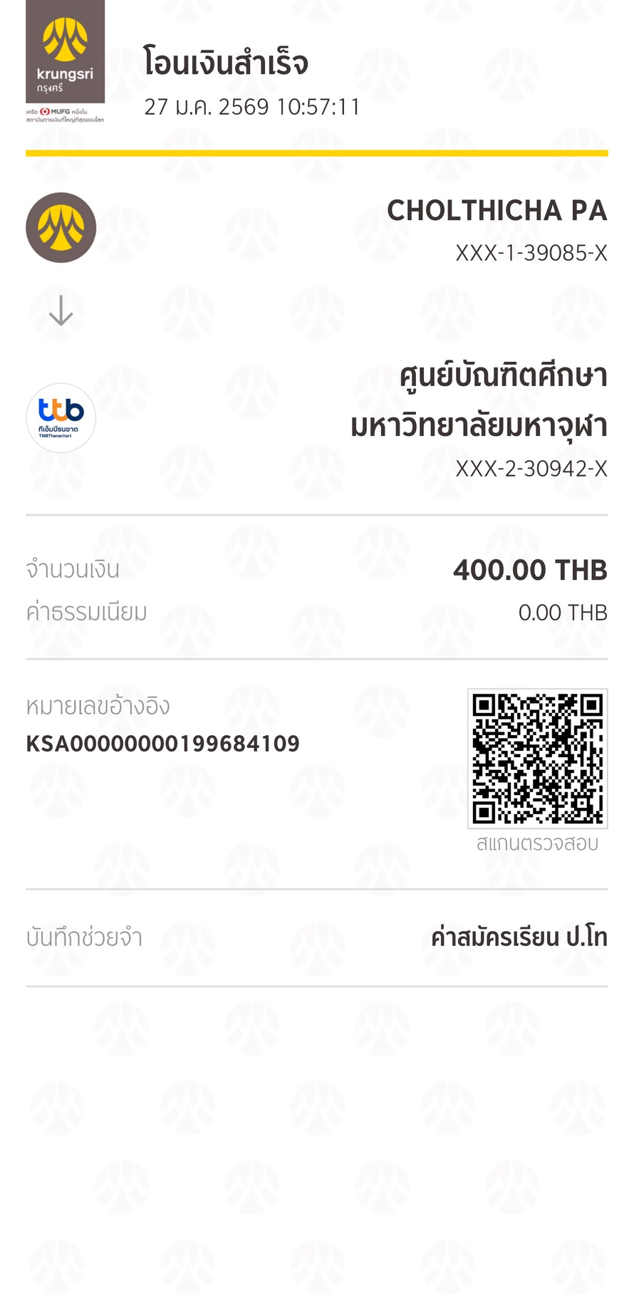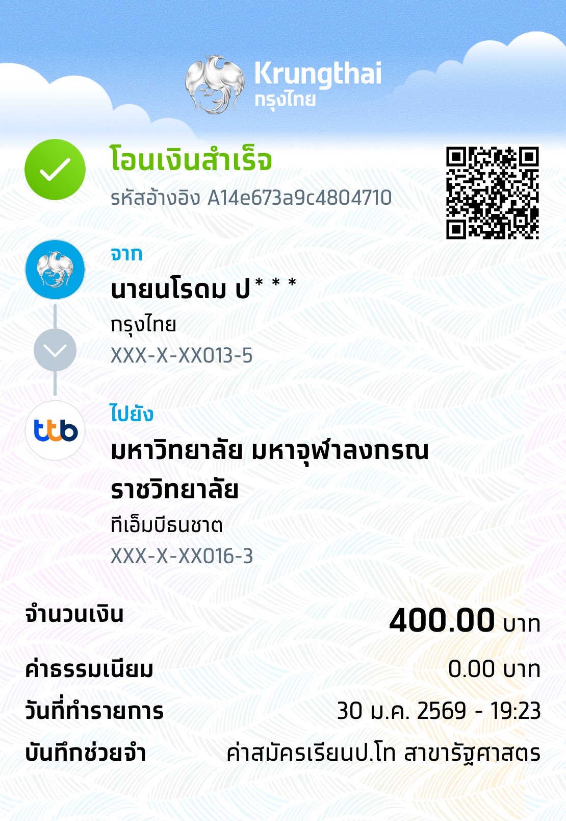 | 157 | นางสาวรัตนาพร ผลรุ้ง | สาขาวิชาพุทธบริหารการศึกษา (ค.ม.) - ภาคสมทบ | 400 | 01/04/2568 : 20.15 น. | ดูภาพ |