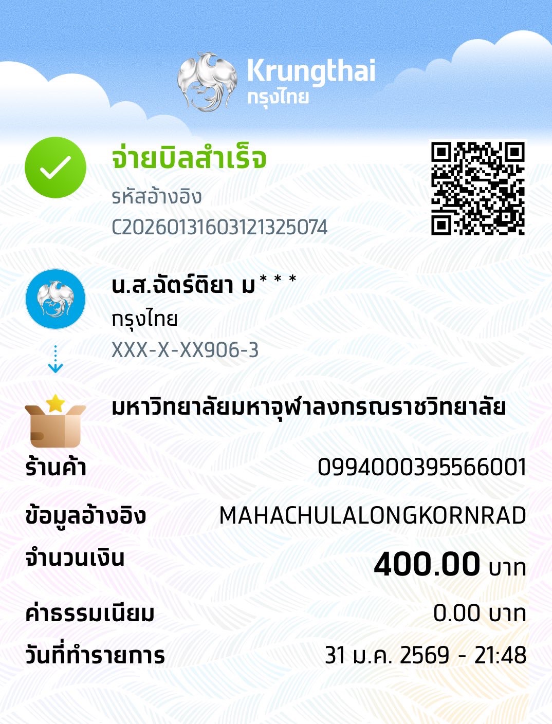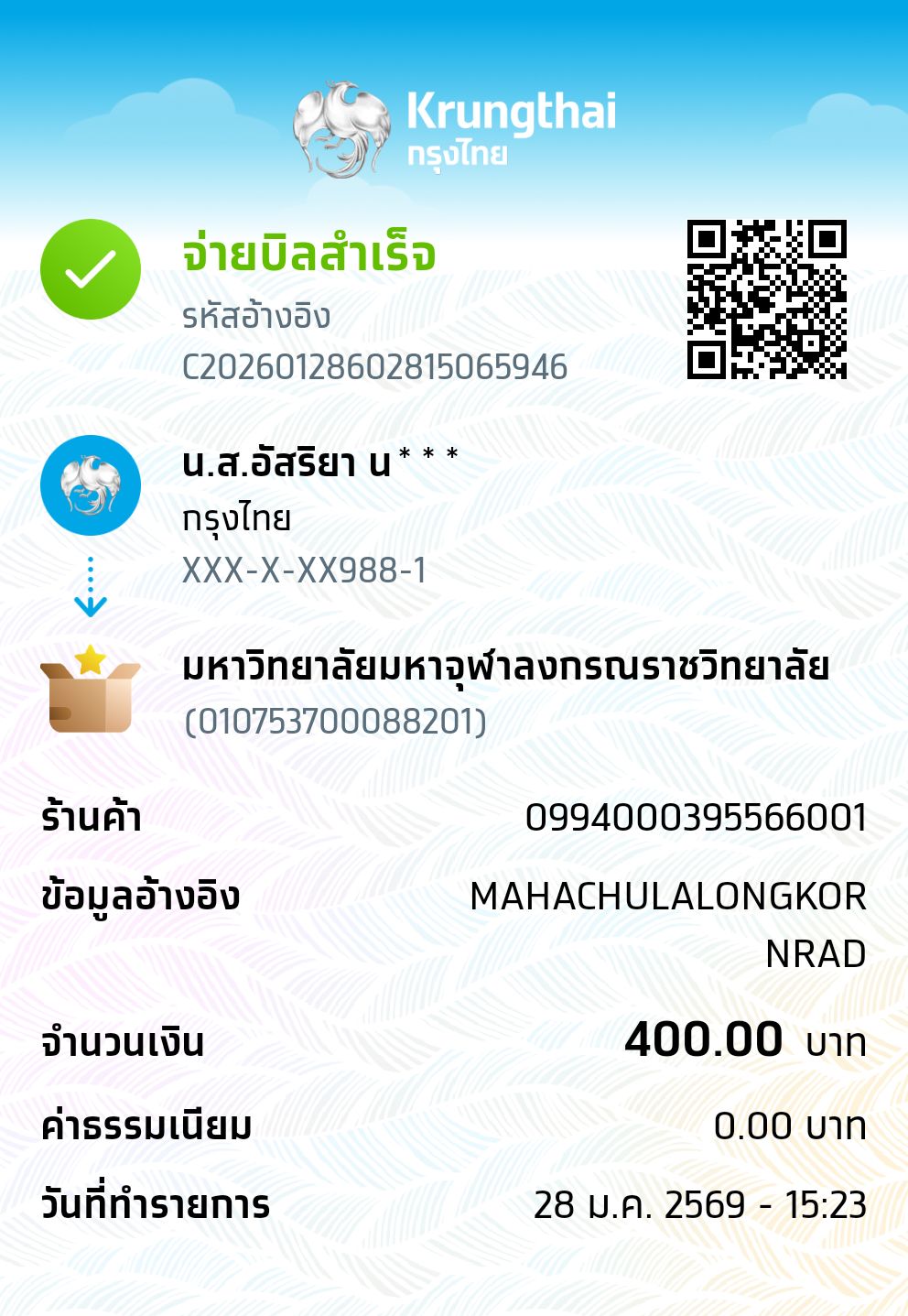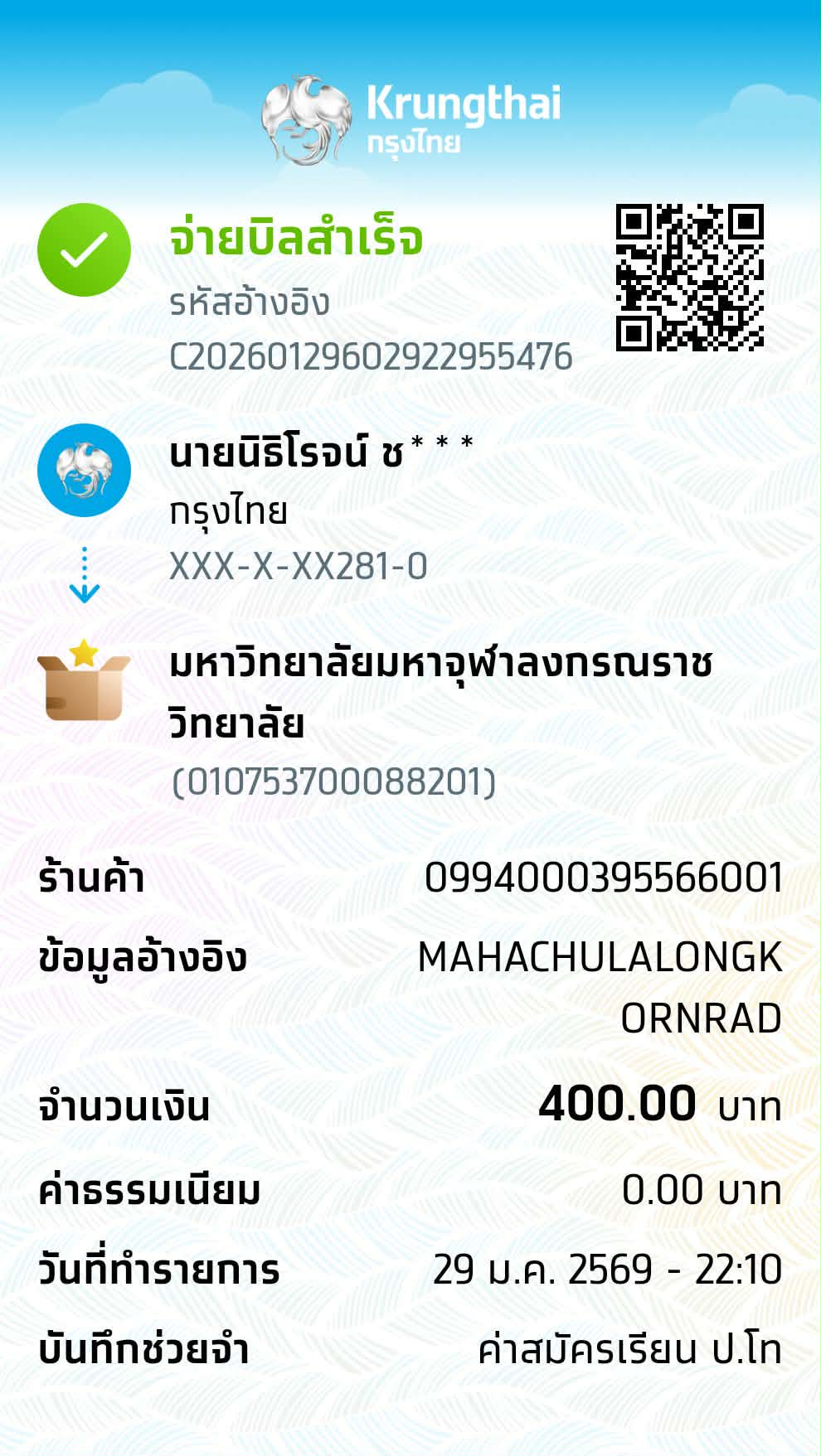| 157 | นางสาวรัตนาพร ผลรุ้ง | สาขาวิชาพุทธบริหารการศึกษา (ค.ม.) - ภาคสมทบ | 400 | 01/04/2568 : 20.15 น. | ดูภาพ |
