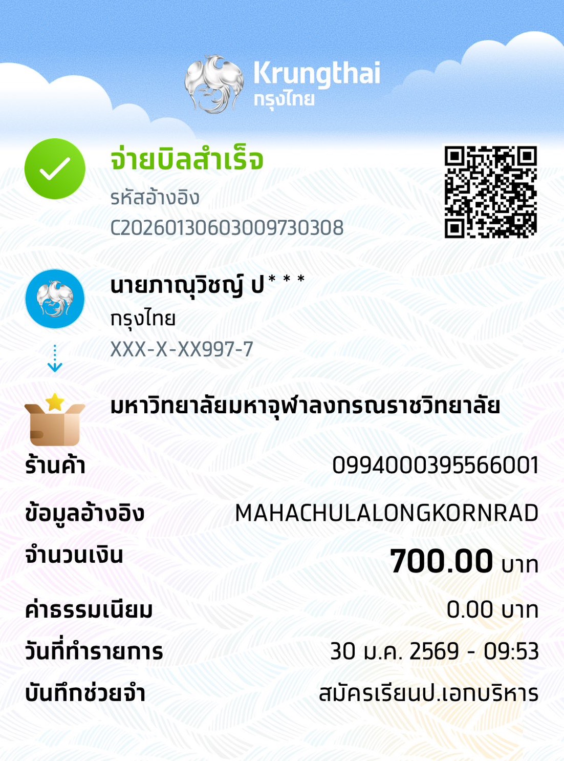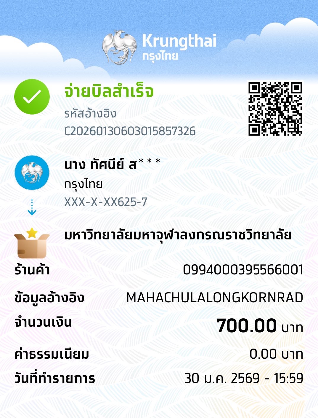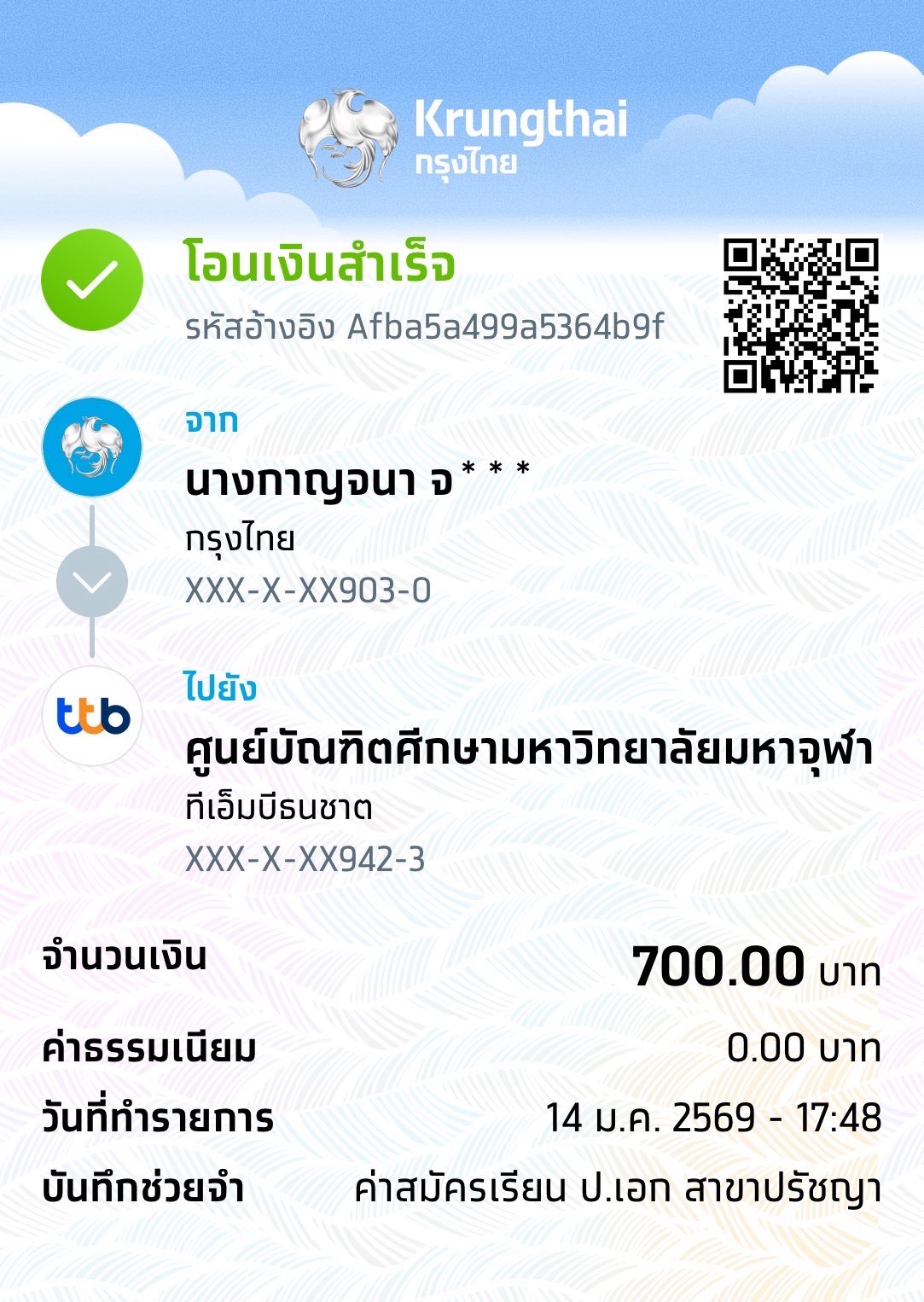 | 211 | นางสาวปวิตรา ทิพย์เนตร | พุทธบริหารศึกษา | 700 | 14/12/2568 : 17.03 | ดูภาพ |