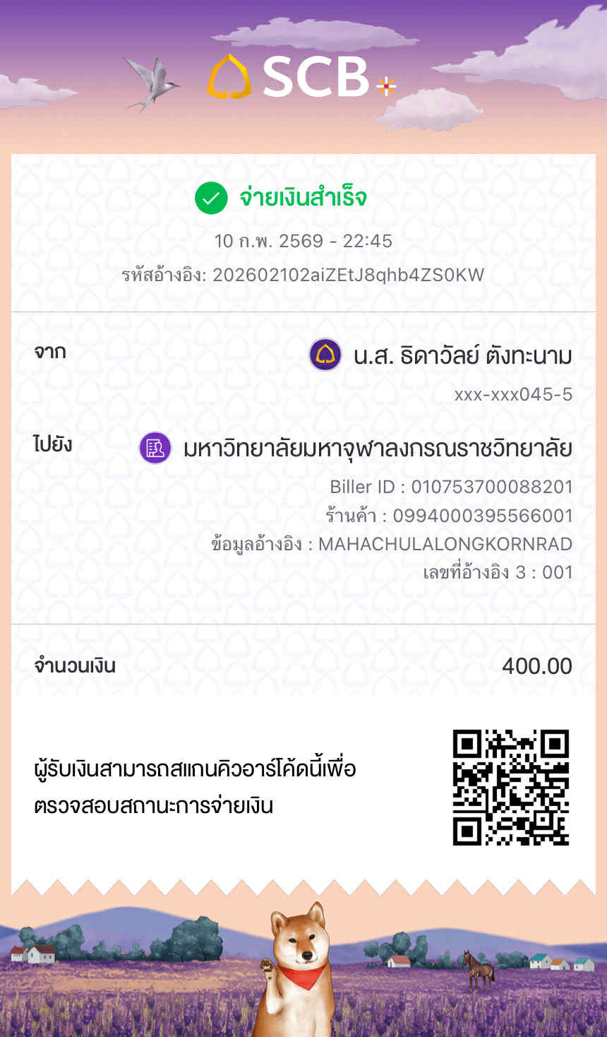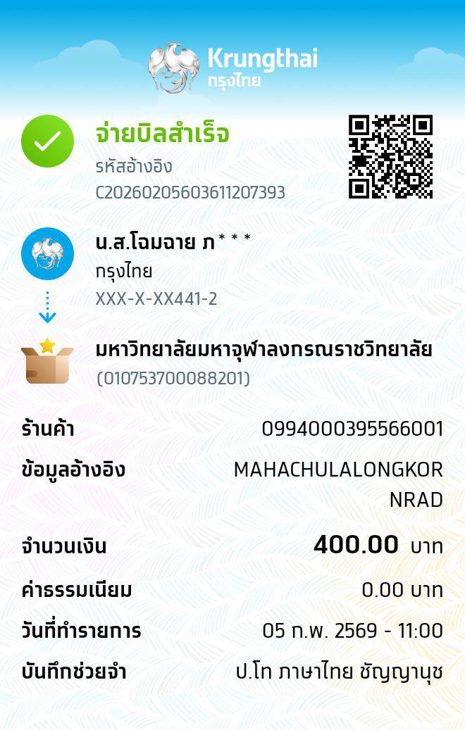 | ลำดับที่ | ชื่อ - ฉายา/นามสกุล | สาขาวิชา | จำนวน (บาท) | โอนชำระวันที่ : เวลา | สำเนาสลิปการโอน |